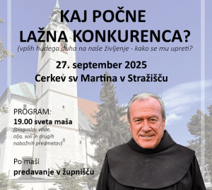 27. 9. – drugo predavanje eksorcista, p. Petra Vrabca, o delovanju hudiča v današnjem svetu z naslovom: “kaj počne lažna konkurenca”. Ob 19h bo sveta maša (z blagoslovom vode, olja, soli in nabožnih predmetov). Sledilo bo predavanje v župnišču.